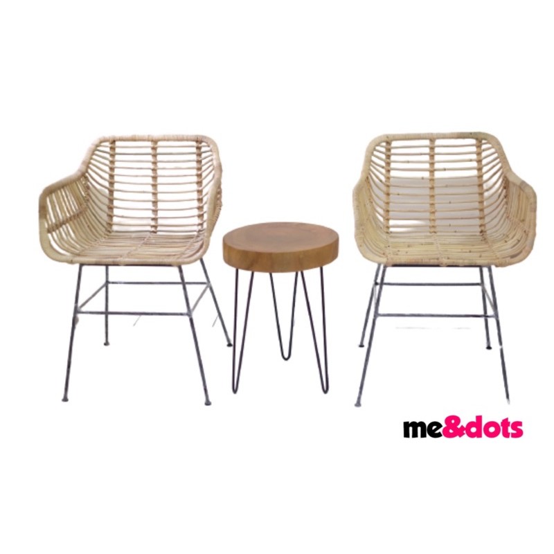 Rincian:1. Harga paket 2 kursi dan 1 meja, dengan ukuran: Panjang = 43cm Lebar = 53cm Tingggi sampai dudukan = 47cm2. Meja kayu dengan rangka besi ukuran: Diameter = 35cm,tinggi 47cm3. Kursi bahan rotan asli dengan rangka besi di bagian dudukan, dan kaki juga rangka besi4. Untuk meja dikarenakan dari bahan kayu asli, tiap meja motif kayu nya beda Cara pemesanan :1. Transaksi Shopee belum termasuk ongkos kirim2.Transaksi Shopee pilih pengiriman reguler ( jadi dikenakan minimum charge 1 kg), apabila kurir Shopee datang, kita hanya memgirimkan invoice.3. Kursi di karenakan dihitung kubikasi, kita kirim kursi lewat ekspedisi di luar Shopee.4. Ongkos pengiriman kursi lewat ekspedisi transfer manual ke kami5. Invoice dan kursi tidak akan sampai di tujuan di waktu yang bersamaan karena beda kurir. (kembali ke poin 2 yaitu invoice kirim lewat kurir Shopee sedangkan kursi kirim lewat ekspedisi lain).6. Apabila kurang di mengerti bisa chat dulu ke